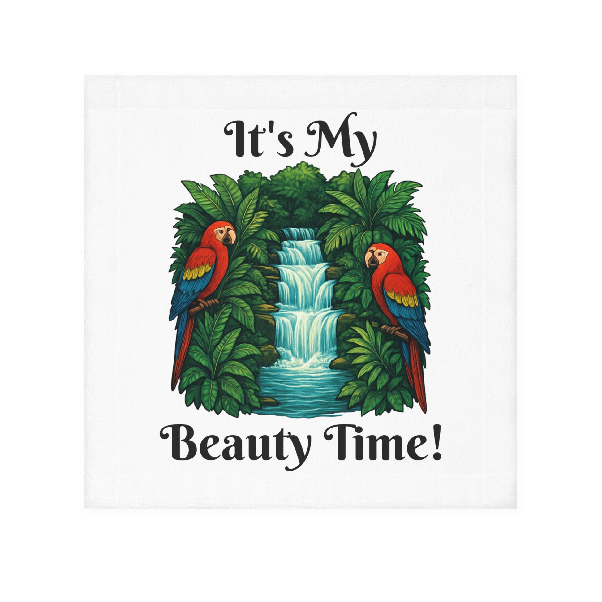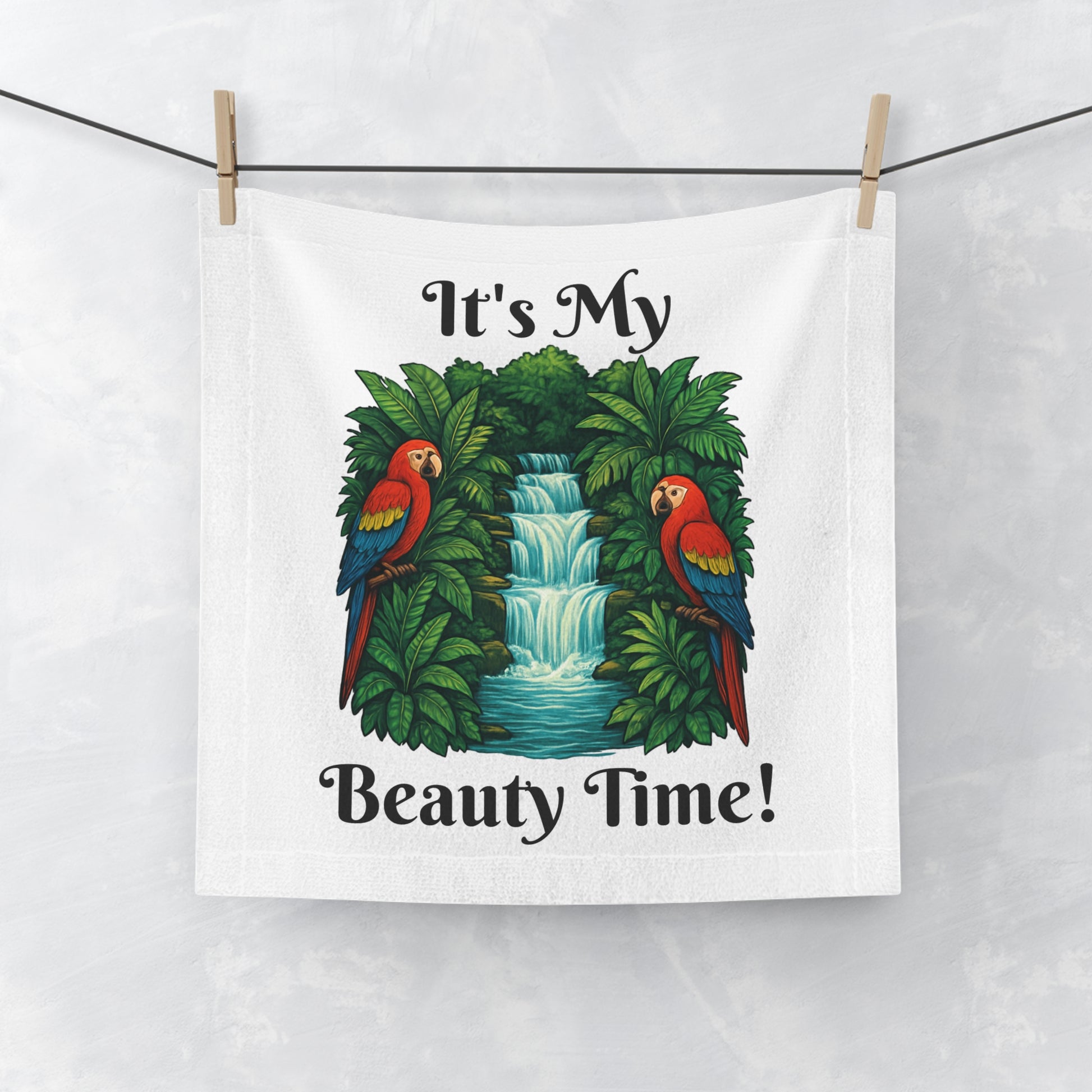 Transform your skincare routine with this vibrant "It's My Beauty Time!" face towel. Designed to add a splash of color and joy to your daily rituals. Made with a durable polyester front and a soft cotton back, it combines strength with comfort. The lively print features beautiful tropical birds, providing a refreshing vibe that brightens your bathroom or spa space. Perfect for beauty enthusiasts, this towel is not just an essential; it’s also a statement piece. Ideal for personal use, a guest face towel or as a delightful gift for birthdays, childbirth, and wellness; making every moment feel special and serene.