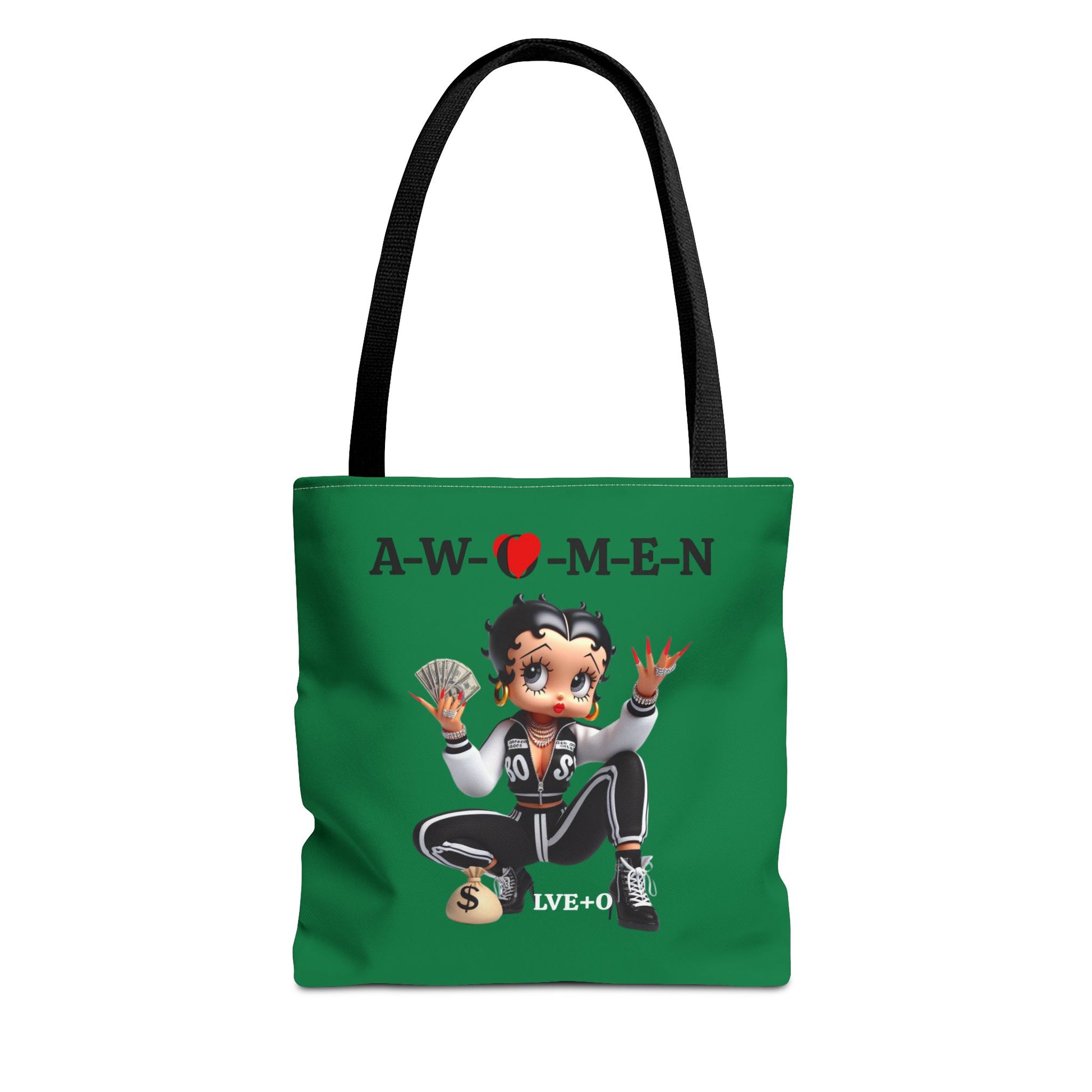 Betty Boop AWOMEN Tote Bag is a stylish and strong statement carryall that is perfect for everyday use. The vibrant design gives off an empowering and fashionable vibe, making it a great addition to any casual outfit. Women sacifice and achieve a lot for humankind. Women deserve equal pay and benefits. A superb message gift for birthdays, childbirth, wellness, events, and other special occasions. Turn it around for a dark green body purse with your chosen handle color.
