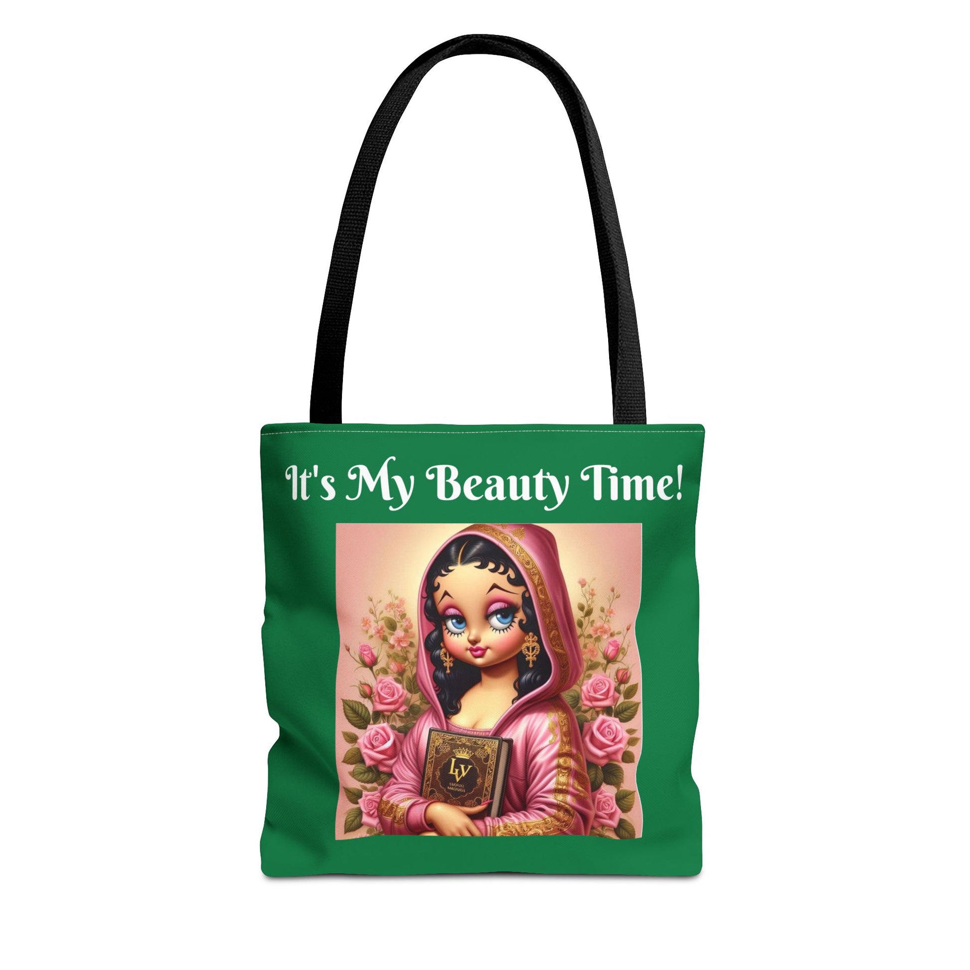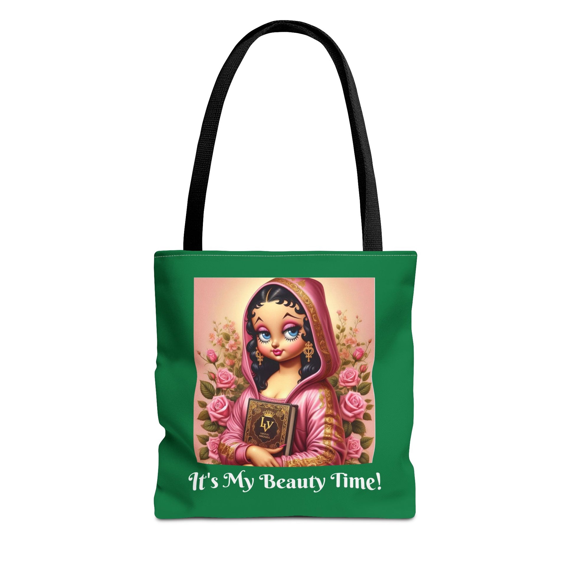 It's My Beauty Time! ~ Betty Boop Mona Reads Tote Bag is cute and perfect for carrying your daily essentials and electronics. This booped up Mona design shows a fun and playful vibe. Ideal for those who love beauty makeovers, retro characters and vintage aesthetics. Fun gift for book lovers, birthdays, childbirth, wellness, and other special occasions. Turn it around for a solid darkgreen body purse with your chosen handle color.