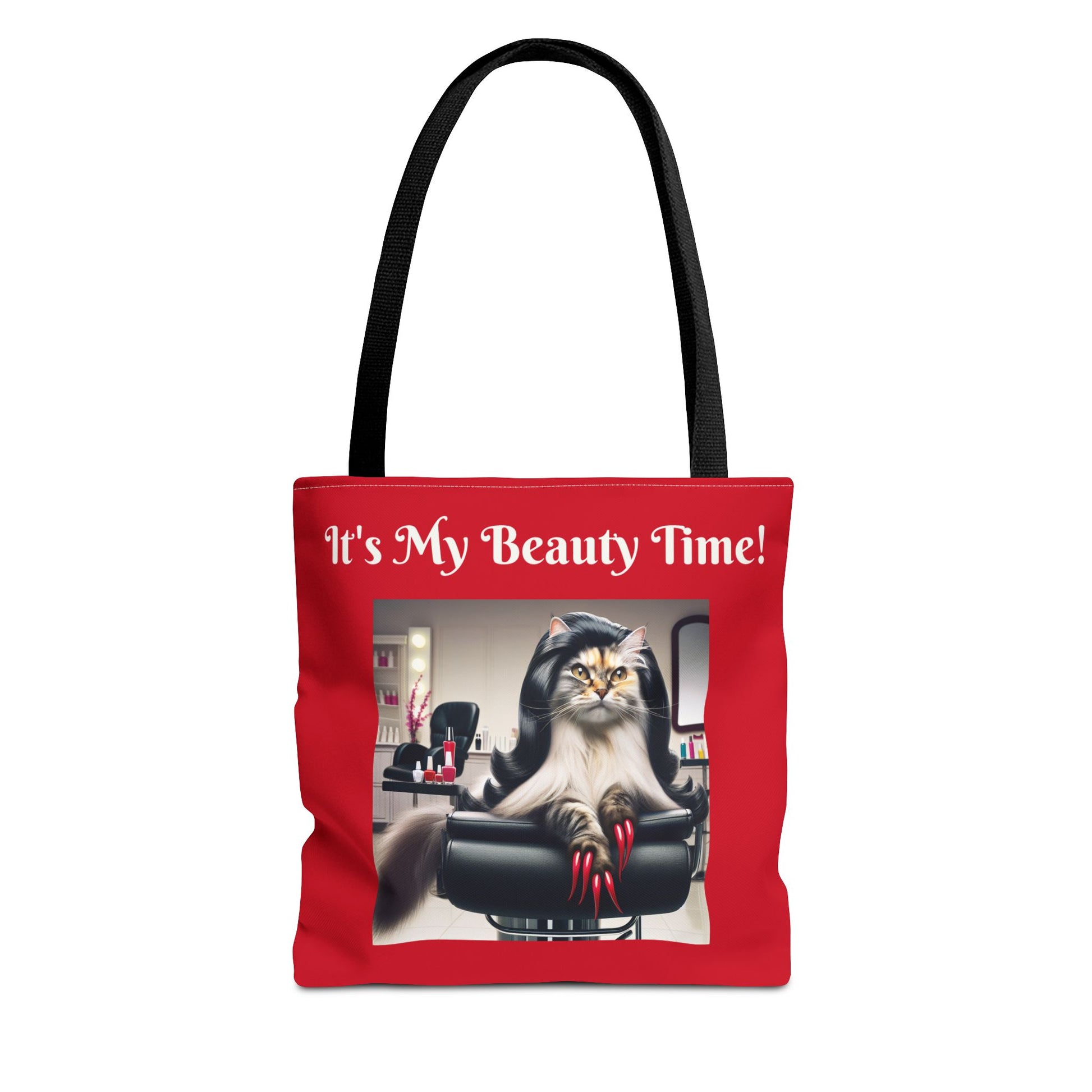 It's My Beauty Time! ~ Confident Cat Tote Bag is purr-fect for anyone who loves getting regular soothing manis and pedis. Carry your essentials in this daring cat image handbag that projects you are serious about your beauty care. Scary funny gift for cat and beauty lovers for birthdays, childbirth, wellness, and other special occasions. Turn it around for a solid dark red body purse with your chosen handle color.