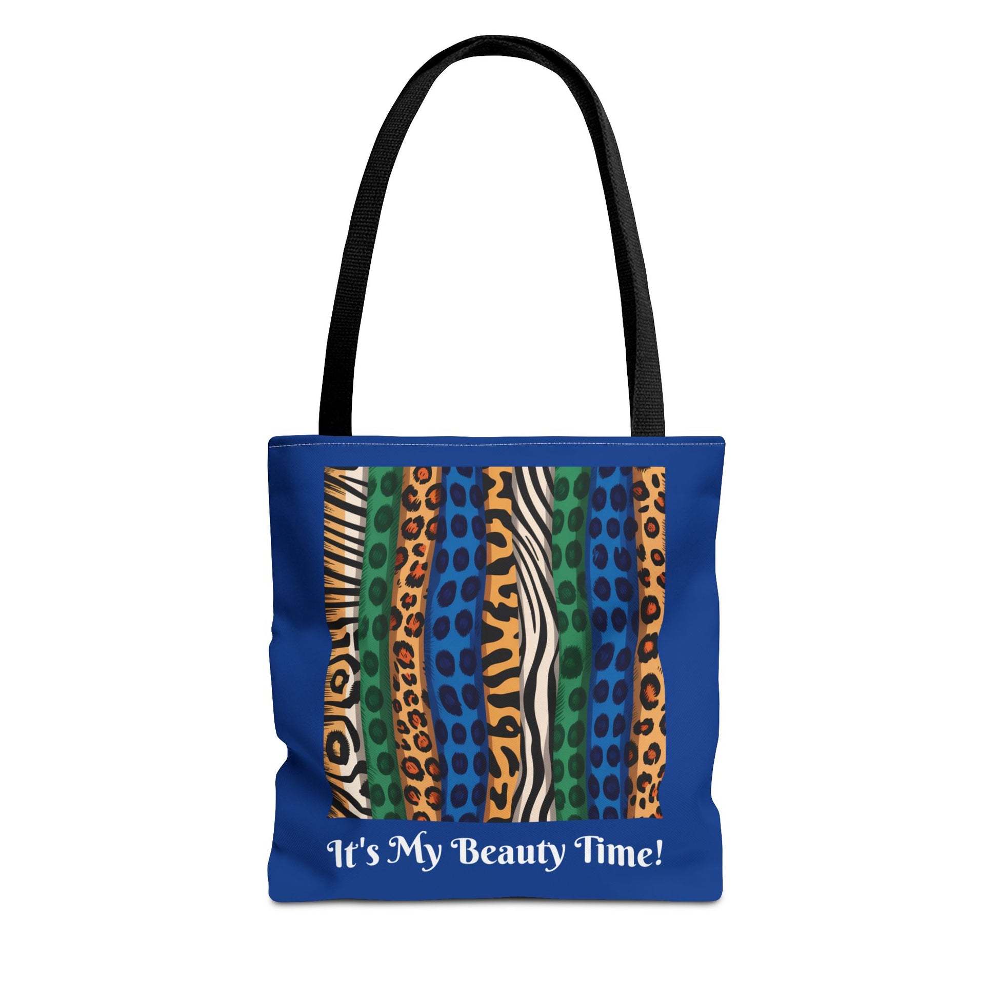 It's My Beauty Time! ~ is a vibrant multi-color and stylish tote bag, perfect for those who love to express their personality through bold designs. This handbag is not just a practical accessory; it’s a statement piece! The vivid colors and fun patterns create a lively vibe that adds excitement to any outfit. Ideal for casual outings, shopping trips, or weekend get aways. Great gift for birthdays, childbirth, wellness, and other special occasions. This purse has blue, green, and natural colors of cheetah, zebra, leopard, and tiger prints encased in dark blue on the front and back sides.