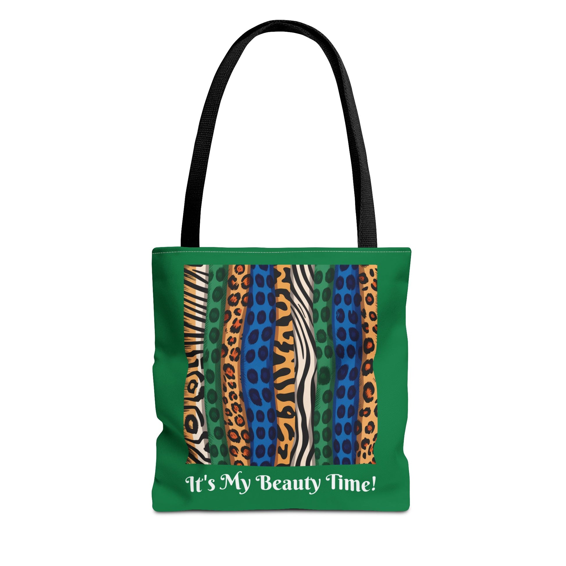 It's My Beauty Time! ~ is a vibrant multi-color and stylish tote bag, perfect for those who love to express their personality through bold designs. This handbag is not just a practical accessory; it’s a statement piece! The vivid colors and fun patterns create a lively vibe that adds excitement to any outfit. Ideal for casual outings, shopping trips, or weekend get aways. Great gift for birthdays, childbirth, wellness, and other special occasions. This purse has blue, green, and natural colors of cheetah, zebra, leopard, and tiger prints encased in dark green on the front and back sides.