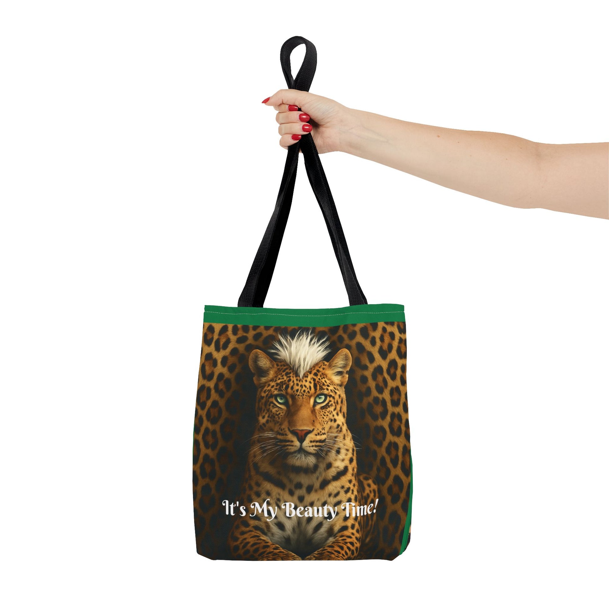 Carry a touch of bold confidence with this vibrant tote. A regal leopard portrait stares forward from a framed subtle spotted background and the statement headline “It’s My Beauty Time!” — a nod to self-care and fierce style. The roomy boxed-corner silhouette holds daily essentials with ease; the reinforced handle stitching and medium-weight polyester keep the bag sturdy through errands, commute rituals and social outings. Use it to bring a little wild energy to your busy life. Great gift for birthdays, childbirth, wellness, and other special occasions.