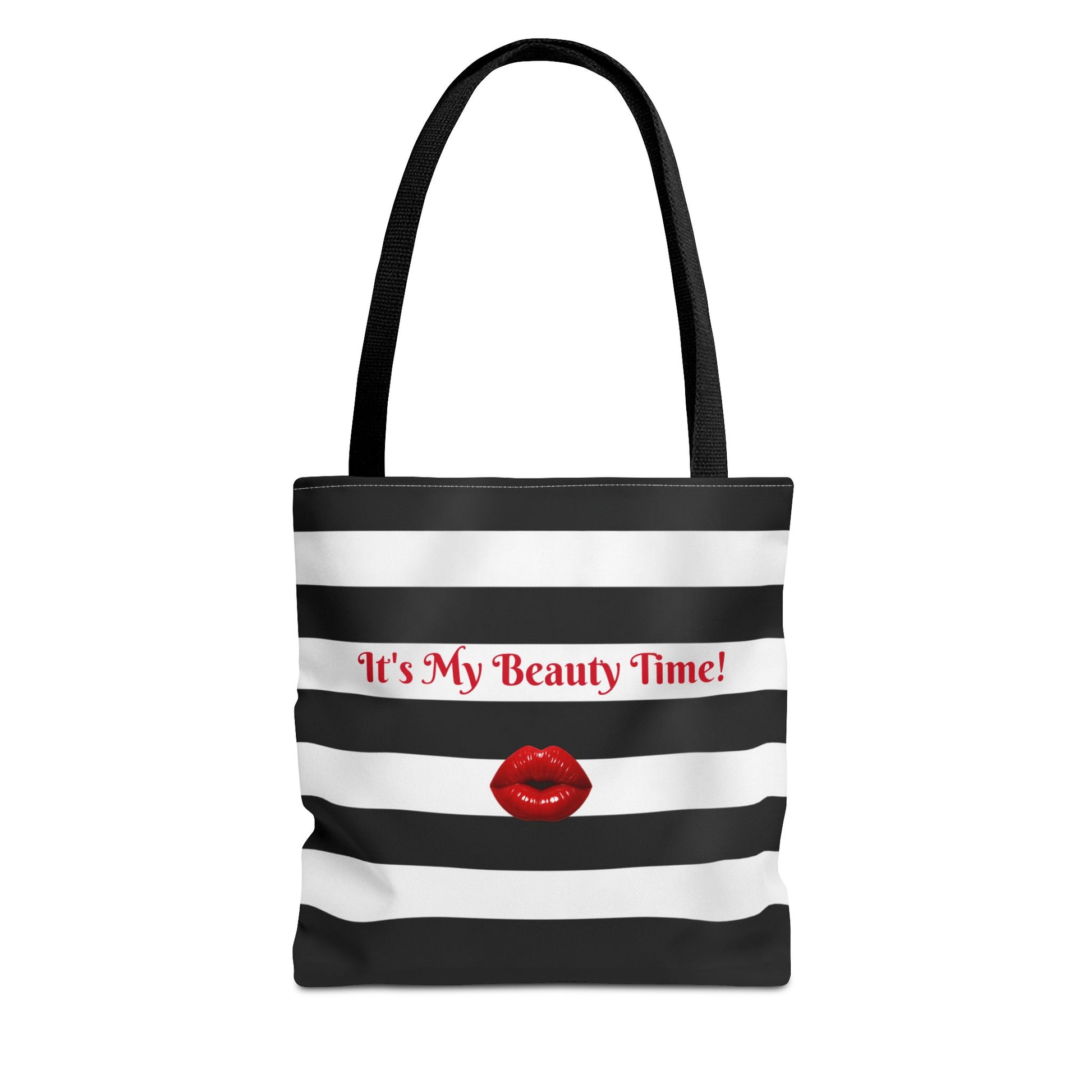 Striped in bold black and white with red lips and the cheeky slogan, "It's My Beauty Time!", this tote brings bright confidence to everyday routines. Roomy boxed corners and a reinforced-handle seam mean it carries hair tools, skincare, and a small vanity kit without sagging. The smooth polyester shell resists wrinkles and dries fast after accidental spills, while the non-woven laminate interior keeps items tidy. Fun purse for salon spa days or social gatherings. This bag is a stylish declaration that your routines matter.